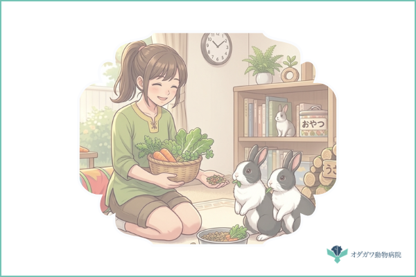 水分摂取の工夫も大切です。ウサギによって給水器より器(皿)の方が飲みやすい場合があります。冬場は水がぬるくなる工夫をしたり、複数箇所に水を用意するとよいでしょう。新鮮な野菜(水菜、小松菜など)を少量与えることも水分補給の助けになります。
