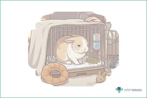 ストレス軽減のために、ケージの置き場所、温度・湿度の管理、他の動物との距離感などを見直しましょう。ウサギは1日の大半をケージで過ごすため、ケージ内の環境が快適であることが非常に重要です。また、飼い主との安定した関係性(適度なスキンシップ、驚かせない、大きな声を出さない)もウサギの精神的安定につながります。