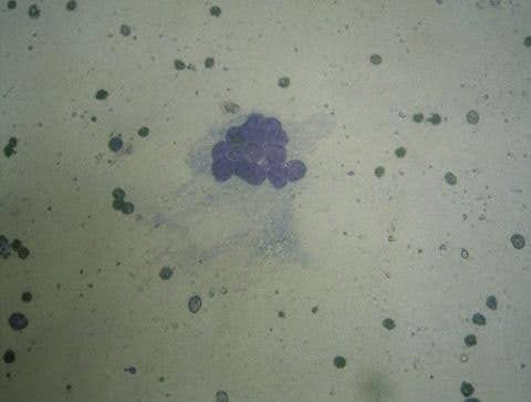 細胞診(しぼうしん:腫瘍の一部を細い針で吸い取り顕微鏡で調べる検査)を行い、腫瘍の性質を確認しました。