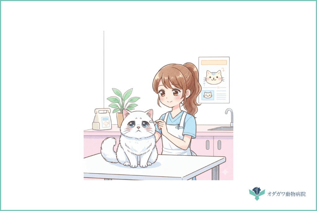 鼻涙管が完全に詰まっている場合は、動物病院で鼻涙管洗浄という処置を行うことがあります。ただし、猫の場合は鼻涙管が非常に細く、洗浄が難しいケースも多いです。