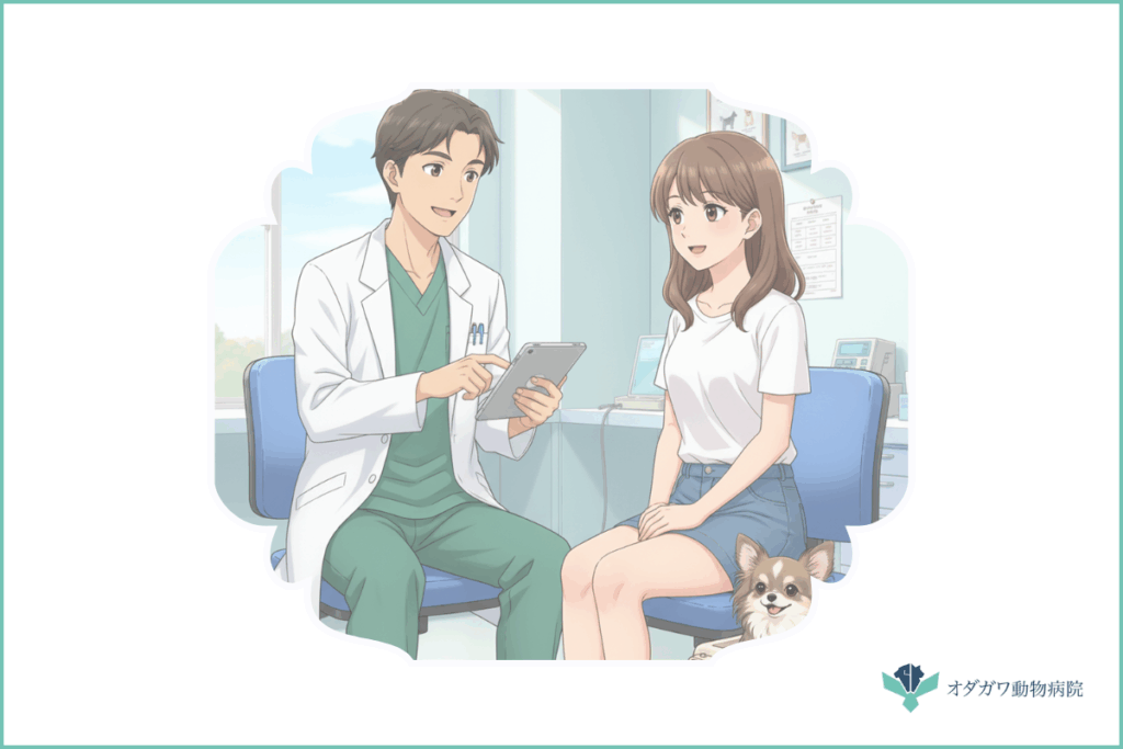動物病院を受診すると、まず獣医師が詳しく問診を行い、身体検査を実施します。その結果に応じて、必要な検査や治療が進められます。