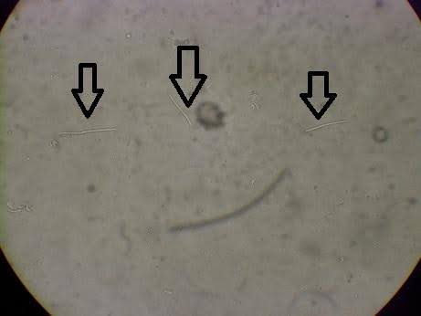 顕微鏡で便を確認すると、写真で確認できるような棍棒(こんぼう)状の特徴的な菌が多数認められました。