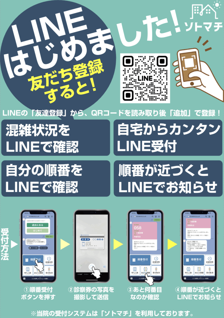 病院に到着されましたら、必ず受付にて「LINE受付済」であることをお伝えください。